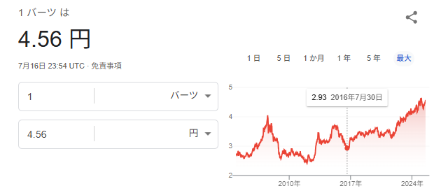約9年前の2016年7月30日には、1バーツ=約2.9円でした。それが2025年10月現在には4.6円を超える水準になっています。約58.6%もの円安バーツ高が進行している計算になります(4.6 ÷ 2.9 ≒ 1.586)。